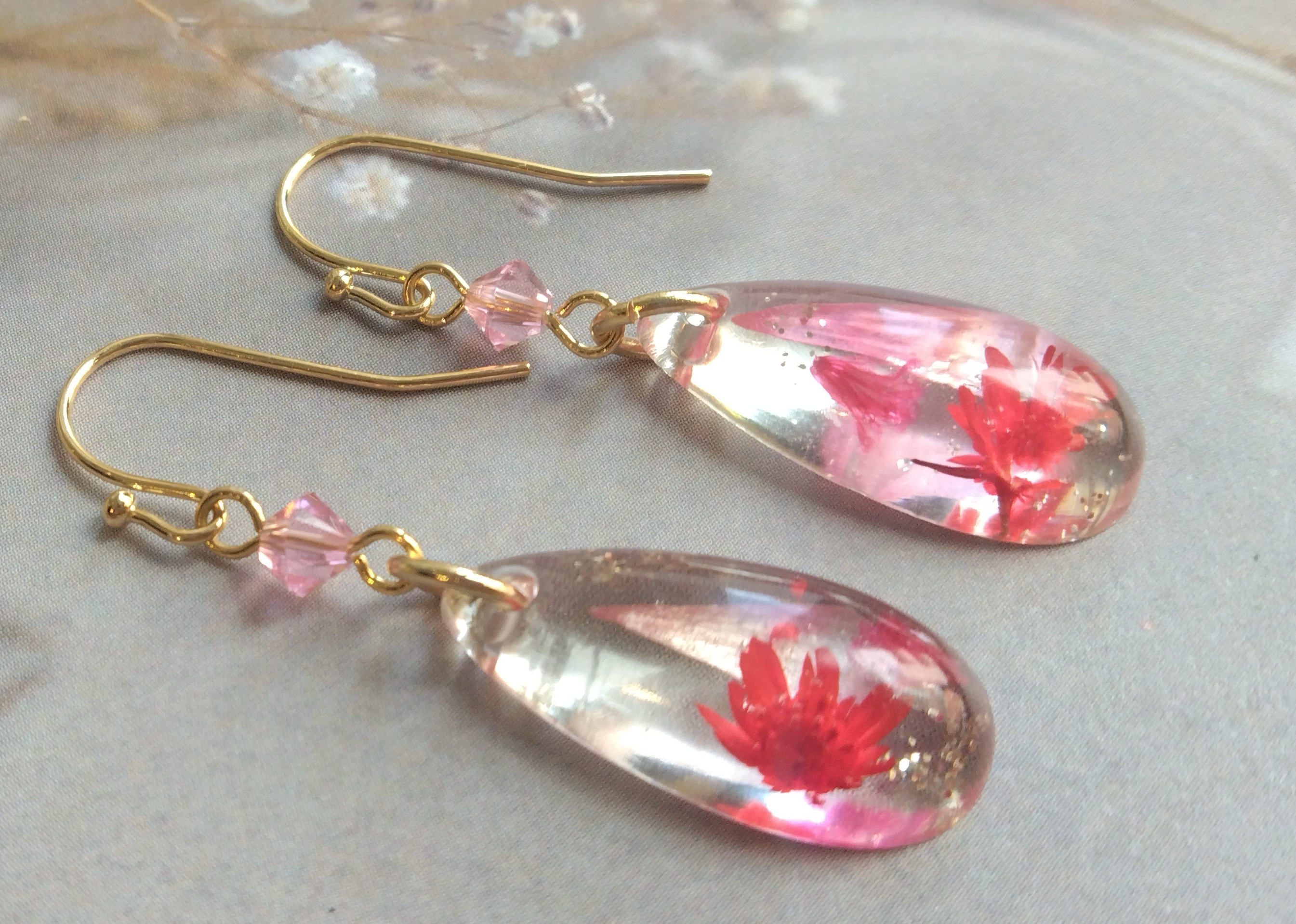 本物のお花やパールを入れて、ピアスまたはイヤリングを作ります。